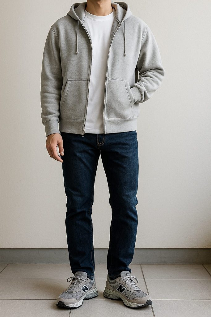グレーのニューバランス2002を使ったメンズコーデは、カジュアルなジーンズスタイルが基本です。例えば、ダークブルーのスリムジーンズにホワイトのTシャツを合わせ、さらにライトグレーのフーディを羽織ると、シンプルながらもスタイリッシュな印象を与えます。このコーディネートは、休日のリラックスした外出にもぴったりです。グレーのスニーカーが全体の色調を引き締め、落ち着いた雰囲気を演出します。