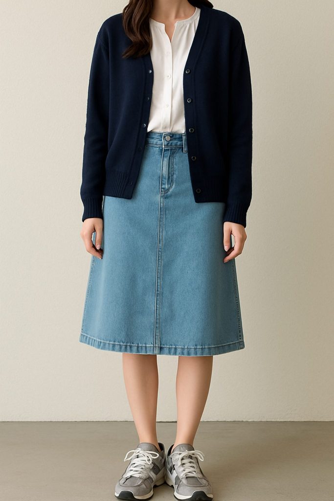 レディースの場合、グレーのニューバランス2002はフェミニンなスタイルにも合わせやすいです。例えば、ライトブルーのデニムスカートにホワイトのブラウスを組み合わせ、ネイビーのカーディガンを羽織ると、清潔感のあるカジュアルエレガントなコーディネートが完成します。グレーのスニーカーが足元を軽やかにまとめ、全体のバランスを取ってくれます。このスタイルは、ショッピングやカフェ巡りなど、様々なシーンで活躍します。