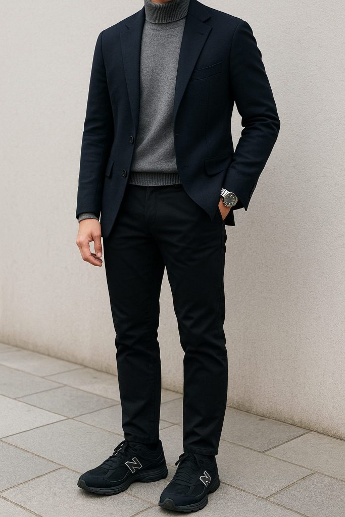 黒のニューバランス2002を使ったメンズコーデは、スマートカジュアルが基本です。例えば、ブラックのスリムチノパンにグレーのタートルネックセーターを合わせ、ネイビーのブレザーを羽織ります。このコーディネートは、オフィスカジュアルにも対応できるスタイリッシュなスタイルです。黒のスニーカーが全体を引き締め、洗練された印象を与えます。シンプルなアクセサリーを加えると、さらに完成度が高まります。