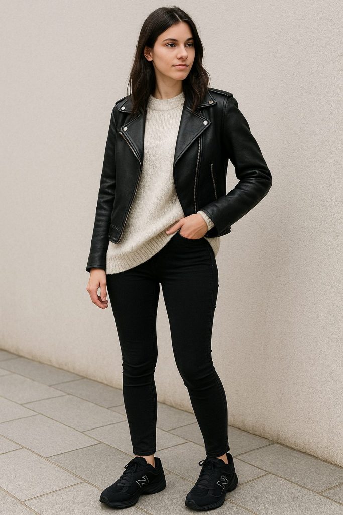 レディースの場合、黒のニューバランス2002はモノトーンコーデにぴったりです。例えば、黒のスキニージーンズに白のオーバーサイズニットを合わせ、ブラックのレザージャケットを羽織ると、クールでモダンなスタイルが完成します。黒のスニーカーが全体の統一感を高め、都会的な雰囲気を演出します。このスタイルは、ショッピングやディナーなど、様々なシーンで活躍します。