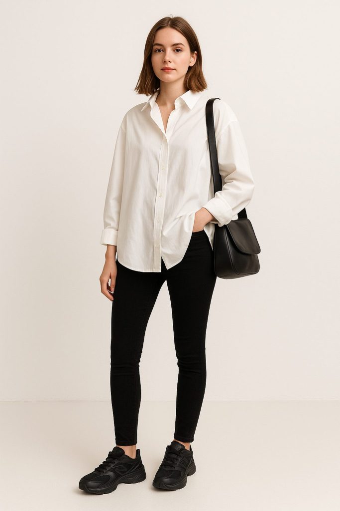 黒のニューバランス530は、リラックス感とシックな雰囲気を兼ね備えたスタイルにぴったりです。トップスには、ゆったりとした白のオーバーサイズシャツを選び、リラックス感を演出。ボトムスは、黒のスキニーパンツを合わせて、シンプルながらもシャープな印象に。足元に黒のニューバランス530を履くことで、全体のコーディネートに統一感を持たせつつ、エフォートレスな雰囲気が漂います。バッグには、黒のレザーショルダーバッグを選び、洗練されたスタイルを完成させましょう。