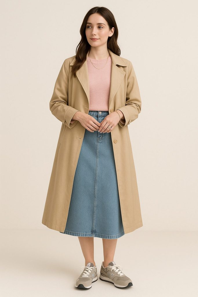 レディースコーデには、グレーの565を使ってシンプルかつエレガントに仕上げましょう。淡いピンクのニットに、ライトブルーのデニムスカートを合わせて、柔らかい色合いで統一します。アクセサリーはゴールドの細めのネックレスやブレスレットで控えめに輝きをプラス。アウターにはベージュのトレンチコートを選び、全体を軽やかにまとめます。これで、おしゃれなカフェランチやショッピングにもぴったりなコーデが完成します。