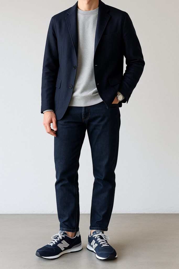 ネイビーのニューバランス565は、知的で落ち着いた印象を与えてくれます。メンズコーデでは、ネイビーの565に、ダークブルーのデニムジーンズを合わせて統一感を出しましょう。トップスには、ライトグレーのスウェットシャツを選び、全体にカジュアルな雰囲気を持たせます。アウターとして、ネイビーのジャケットを羽織れば、スタイリッシュでまとまりのあるコーディネートが完成します。アクセサリーには、シンプルなシルバーの腕時計を合わせて、シンプルながらも洗練されたスタイルを楽しんでください。