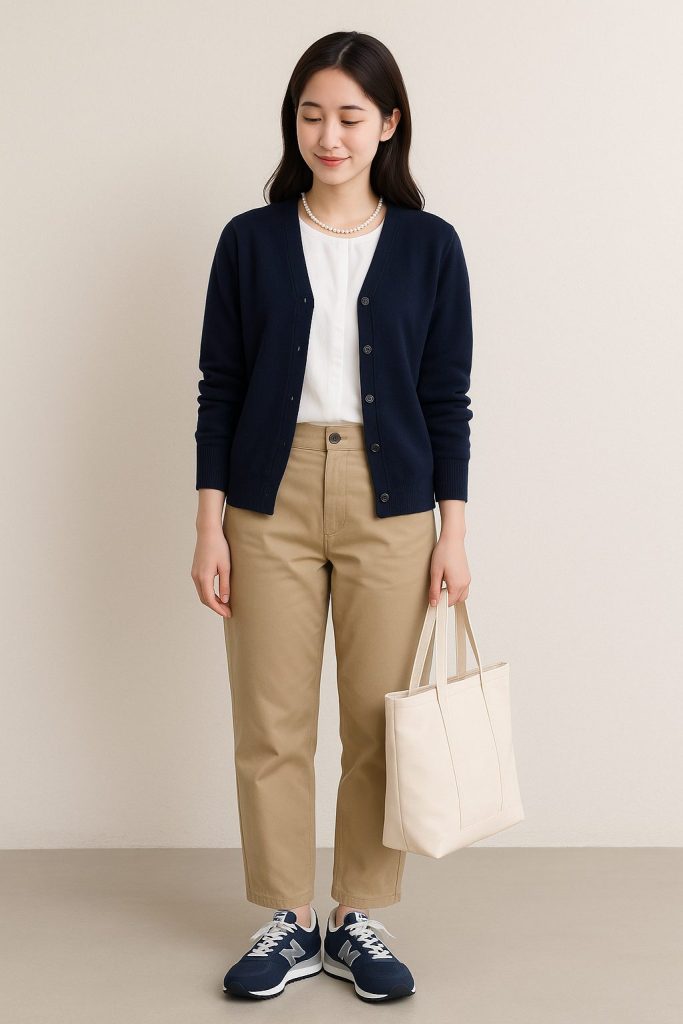 ネイビーの565を使ったレディースコーデでは、清潔感と上品さを兼ね備えたスタイルを目指します。白のブラウスに、ベージュのチノパンを合わせて、爽やかで春夏にぴったりのコーディネートに仕上げます。トップスには、ネイビーのカーディガンを羽織って、全体に統一感を持たせつつ、柔らかい印象をプラスします。アクセサリーには、パールのネックレスやシンプルなトートバッグを取り入れて、上品さを引き立てると、ランチやカジュアルなデートにもぴったりなコーディネートが完成します。