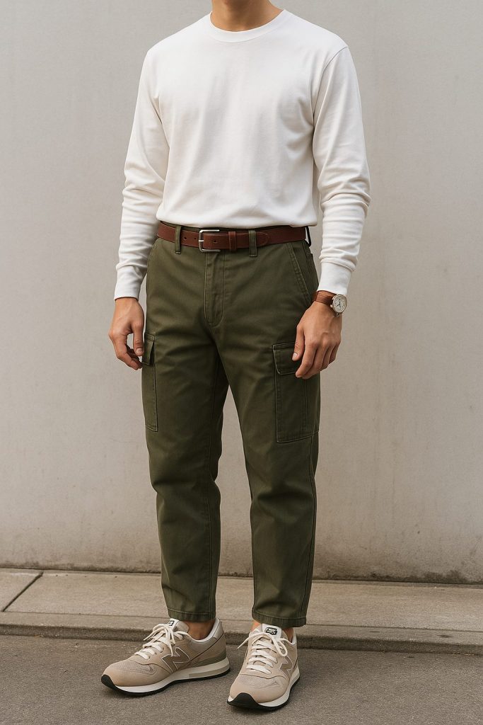 ベージュのニューバランス565は、温かみがあり落ち着いた雰囲気を演出します。メンズコーデでは、ベージュの565に、オリーブグリーンのカーゴパンツを合わせて、リラックス感のあるスタイルに仕上げましょう。トップスには、白のロングスリーブTシャツを選び、シンプルでありながらも季節感のあるコーディネートに。アクセサリーには、ブラウンのレザーベルトや腕時計を取り入れて、全体に統一感とアクセントを加えると、アウトドアやカジュアルな日常にもぴったりなコーデが完成します。