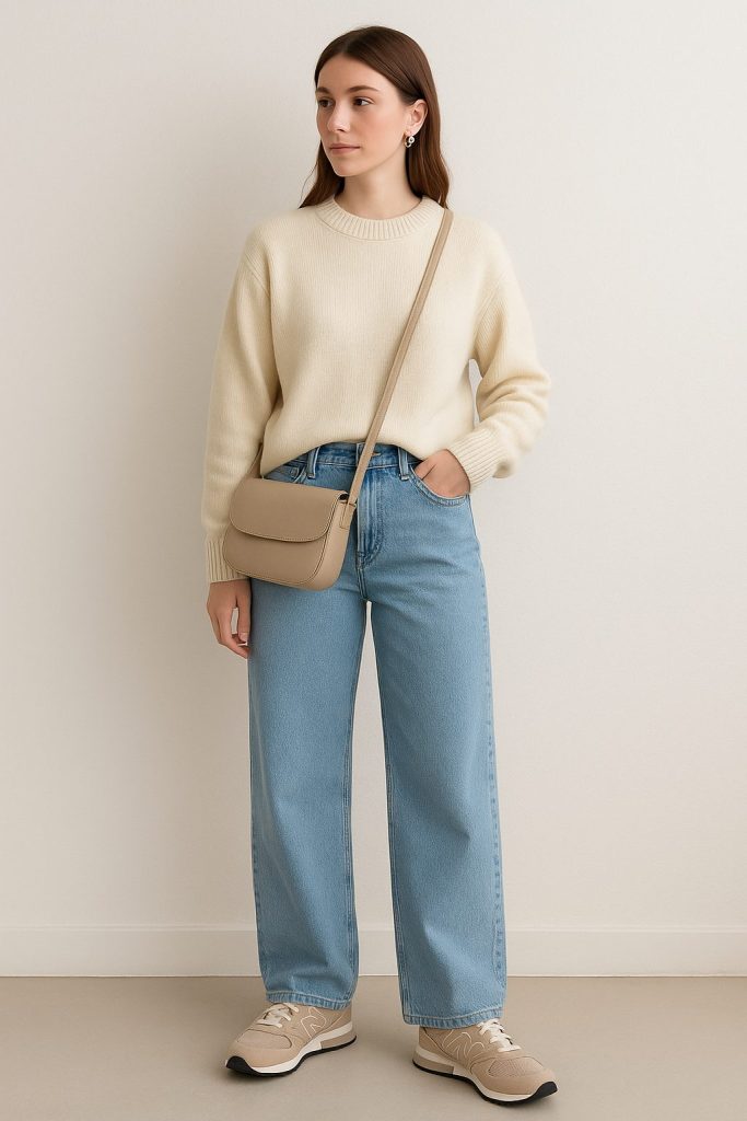 ベージュの565を使ったレディースコーデでは、柔らかでナチュラルな雰囲気を目指します。ベージュの565に、ライトブルーのワイドレッグジーンズを合わせて、リラックス感のあるシルエットを作ります。トップスには、クリーム色のニットセーターを選び、全体を淡い色合いで統一して優しい印象をプラス。アクセサリーには、シンプルなゴールドのフープイヤリングやベージュのクロスボディバッグを取り入れて、ナチュラルで洗練されたスタイルを楽しむことができます。このコーデは、週末のショッピングやカフェ巡りにもぴったりです。