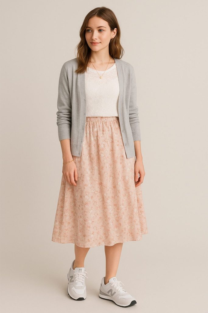 ホワイトの565を使ったレディースコーデでは、清潔感とフェミニンさを両立させましょう。ライトピンクのフローラルスカートに、ホワイトのレースブラウスを合わせて、女性らしい優雅なスタイルを作ります。アウターには、ライトグレーのカーディガンを羽織って、柔らかい印象をプラスします。アクセサリーには、ゴールドの細めのネックレスやブレスレットを取り入れて、上品さを引き立てます。このコーディネートは、ガーデンパーティーやおしゃれなカフェでのランチにぴったりです。