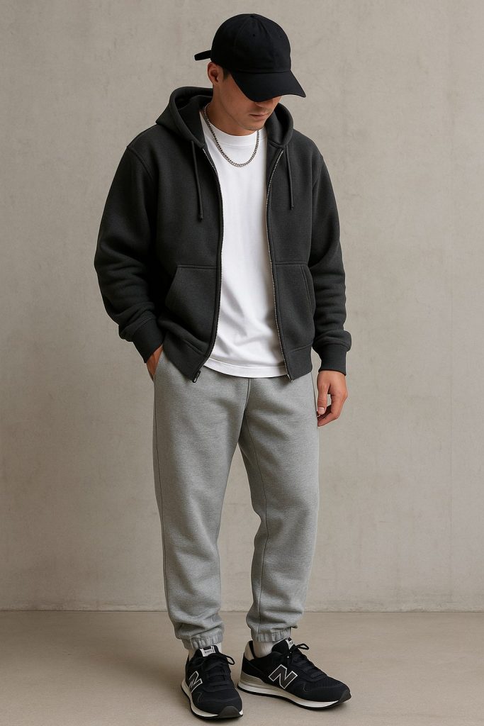 黒のニューバランス565は、シックでモダンな印象を与えます。メンズコーデでは、ブラックの565に、グレーのスウェットパンツを合わせてリラックスしたスタイルを演出。トップスには、ホワイトのシンプルなTシャツと、ダークグレーのフーディを重ねて、カジュアルながらもクールなコーディネートに仕上げます。アクセサリーには、シルバーのチェーンネックレスやブラックのキャップを取り入れて、全体のバランスを取ると、ストリート感あふれるスタイルが完成します。