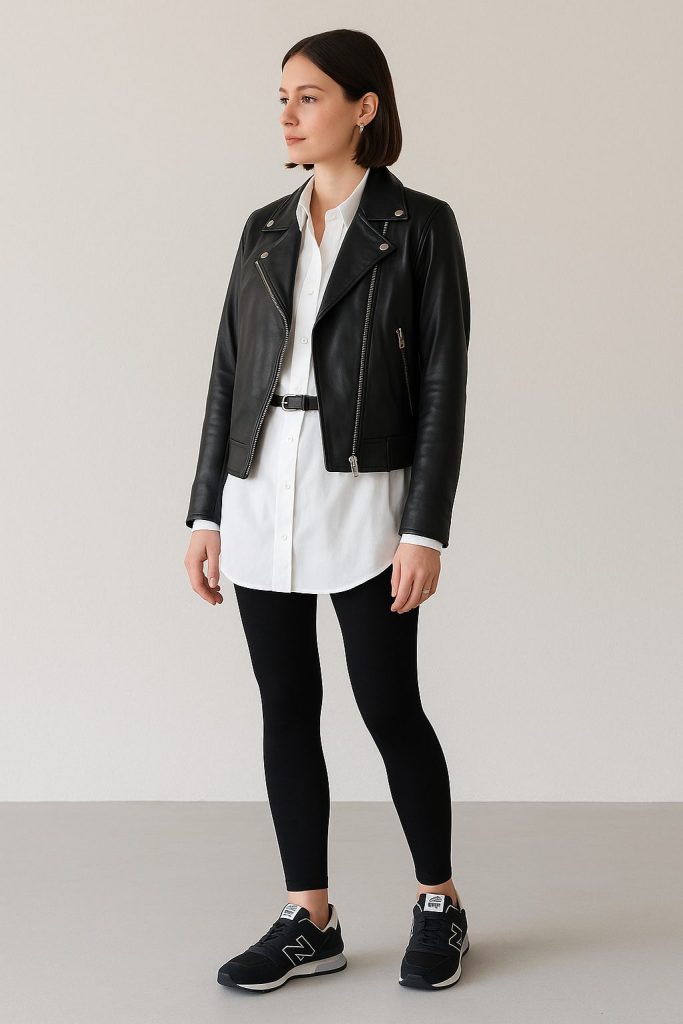 黒の565を使ったレディースコーデでは、スタイリッシュで洗練された雰囲気を目指します。ブラックのレギンスに、白のオーバーサイズシャツを合わせてモノトーンコーデを完成させましょう。トップスに黒のレザージャケットを羽織れば、エッジの効いたスタイルになります。アクセサリーには、シンプルなシルバーのイヤリングや細めのベルトを取り入れて、洗練された大人のカジュアルスタイルを楽しむことができます。このコーデは、街歩きやディナーデートにもぴったりです。