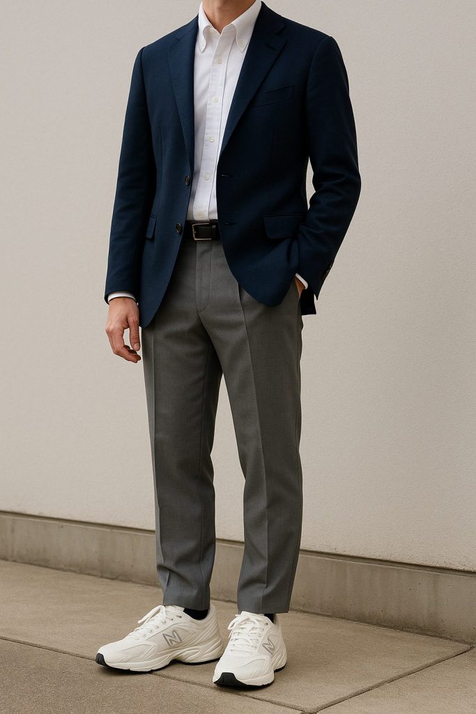 また、オフィスカジュアルにも活用可能です。ネイビーのチノパンとライトグレーのシャツに、グレーの725を合わせると、ビジネスシーンでも違和感なく履けるスマートな印象に。アクセントとして、黒のレザーベルトや時計を加えると、全体のバランスが取れます。