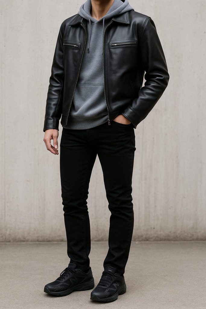 黒のニューバランス725は、シンプルでスタイリッシュなメンズコーデに最適です。例えば、ブラックのスキニージーンズとグレーのフーディーに黒の725を合わせると、モノトーンで統一感のあるクールなスタイルが完成します。さらに、ブラックのレザージャケットをプラスすれば、男らしいロックテイストのコーディネートに仕上がります。