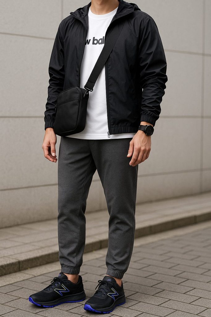 - 仕上げ: 軽量なウィンドブレーカーを羽織って、アクティブな印象をプラス