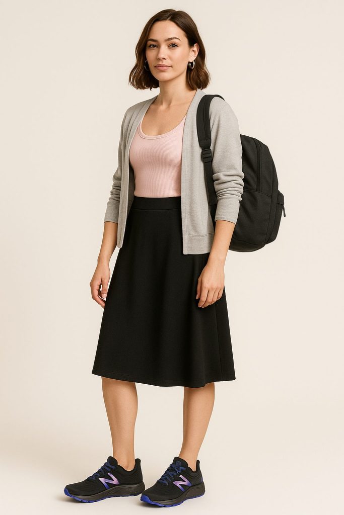 - ボトムス: ハイウエストのスカート(ミディ丈)またはアクティブなレギンス(ブラック)
