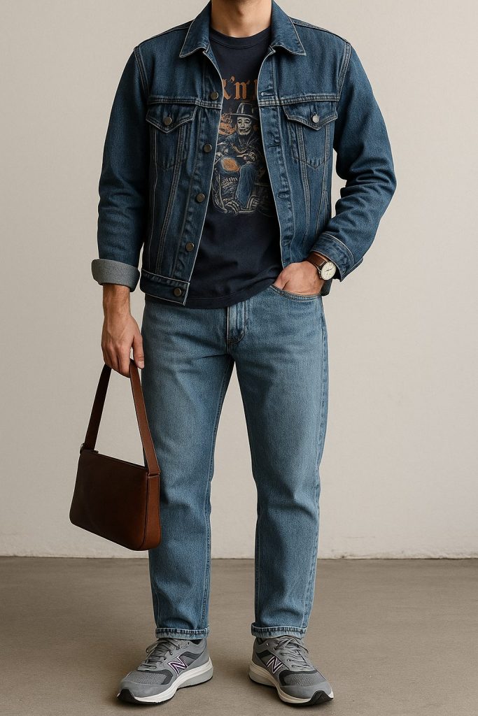 このコーディネートは、旧モデルのクラシックなデザインを引き立てるために、ヴィンテージ風のアイテムを取り入れています。ストレートフィットのジーンズとデニムジャケットの組み合わせは、シンプルでありながら時代を超えたスタイルを演出します。